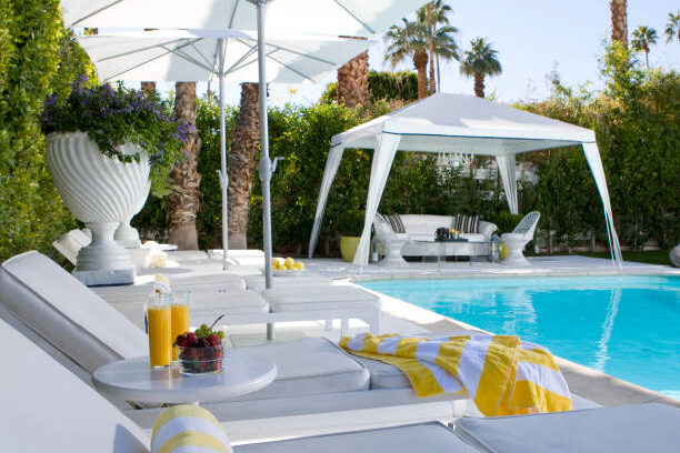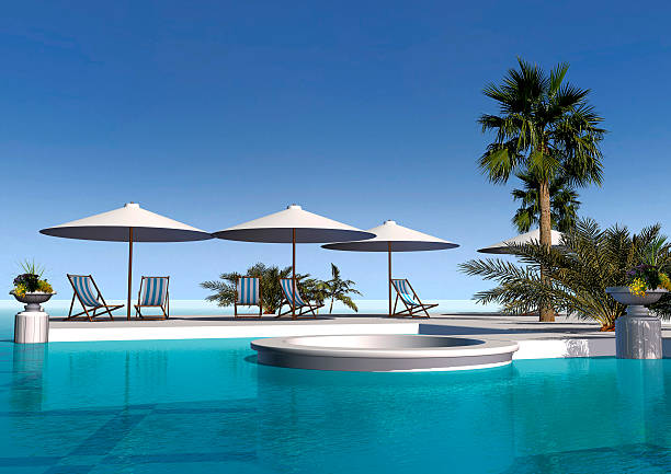 Una piscina circondata da lettini celesti e bianchi e un ambiente circondato da sfumature blu di un cielo sereno creano un’atmosfera di serenità pura. L’acqua cristallina riflette in cielo, mentre il bianco immacolato evoca tranquillità e freschezza. Un angolo perfetto dove ogni momento si trasforma in un’ode al relax.la vacanza è sinonimo di relax.